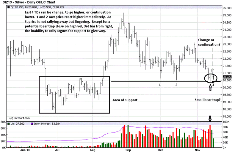The arrow pointing to the sharp increase in volume, and the poor close on the bar, at a support area, resulted in a price gap up from the close, next day. It could be a small bear trap. Friday's close was upper end on the bar, and that says buyers won over sellers for that day. The only caveat we hold is how price has been unable to rally from support right away, as it did at points 1 and 2. Weak rallies lead to lower prices, so buyers better step up on Monday, or silver can break current support.
