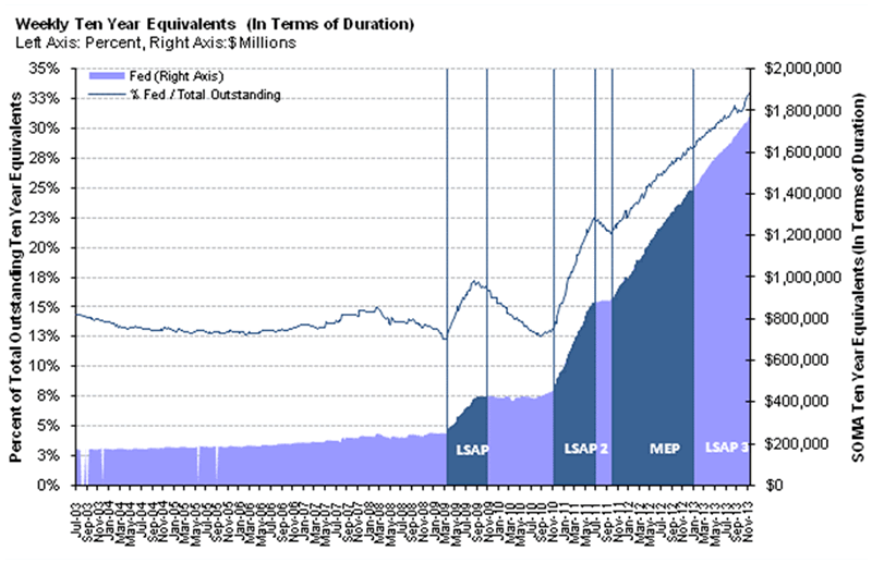 “The most important chart that nobody at the Fed seems to pay any attention to, and certainly none of the economists who urge the Fed to accelerate its monetization of Treasury paper, is shown below. It shows the Fed's total holdings of the entire bond market expressed in 10 Year equivalents (because as a reminder to the Krugmans and Bullards of the world, a 3 Year is not the same as a 30 Year). As we have been pounding the table over the past year, the amount of securities that the Fed can absorb without crushing the liquidity in the "deepest" bond market in the world is rapidly declining, and specifically now that the Fed has refused to taper, it is absorbing over 0.3% of all Ten Year Equivalents, also known as "High Quality Collateral", from the private sector every week. The total number as per the most recent weekly update is now a whopping 33.18%, up from 32.85% the week before. Or, said otherwise, the Fed now owns a third of the entire US bond market.