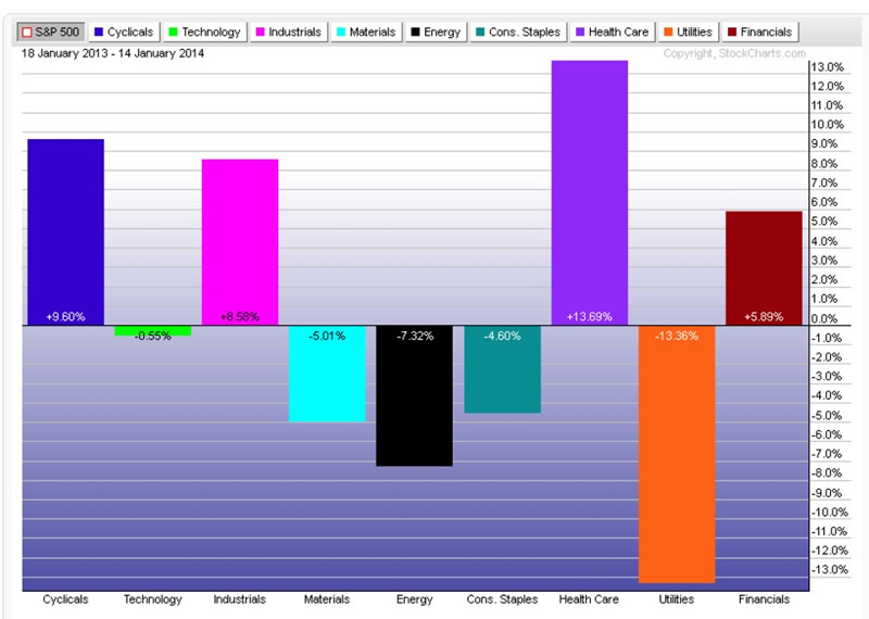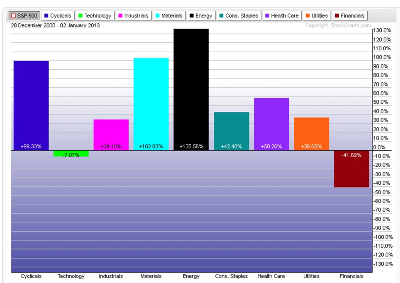 Nevertheless, in 2013, once the S&P 500 again broke out of the secular consolidation formation, the best performing industry groups swung back to the financials, industrials, healthcare and consumer cyclicals (Chart 3).