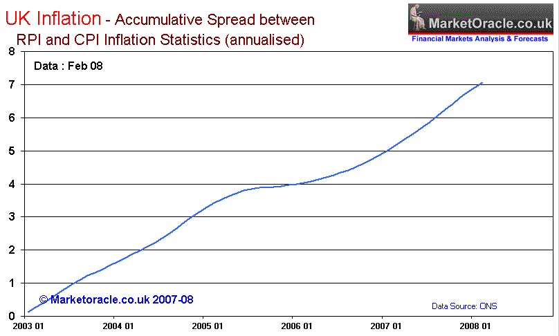 The Retail Price Index (RPI) whilst far from perfect, has long been recognised as a reliable measure of inflation and therefore accepted by both public and private sector workers in pay negotiations. The above graph illustrates the accumulative spread between the CPI and RPI over the last 5 years and clearly shows the degree to which the CPI under reported real inflation by 7%. The British government in 2006 instructed the public sector to link pay deals to the CPI index instead of the RPI index, during which time public sector workers would have seen a loss of 3% in purchasing power.