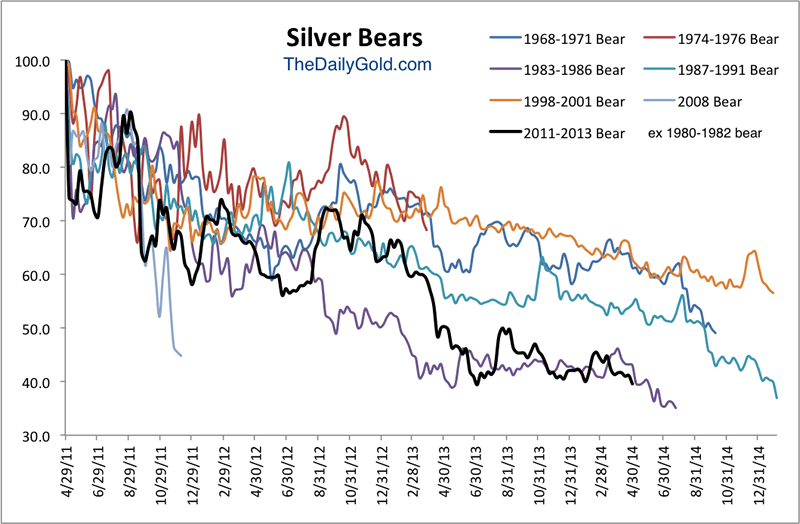 Let me start with the silver complex as its providing the most clarity. We wrote about the coming opportunity in Silver at the end of March. We posited that a break to new lows would likely mark the end of the bear market and signal an excellent buying opportunity. We derived that view from a few charts including the bear market analogs chart which is posted below. The chart (which excludes the 1980-1982 bear) makes a strong case that Silver should bottom sometime in the next four to eight weeks.