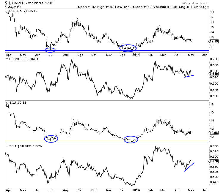 Though Silver has broken below its December 2013 low and is inches from a new bear market low, the silver stocks remain (at the moment) comfortably above their bear market lows. The chart below plots both SIL (seniors), SIL against Silver, SILJ (juniors) and SILJ against Silver. SIL would have to decline 14% to test its December low while SILJ would have to decline 19% to test its December low. The relative strength of the silver stocks amid a breakdown in Silver is a signal that a major trend change is developing.