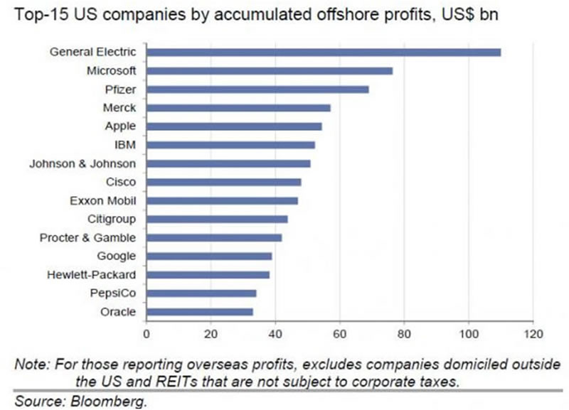 This “off-shore” reality is greatly motivated by the fact that even though the American corporate tax rate is officially 35% approx., “international” branches (affiliates) do not pay this tax until profits are repatriated. In the main most of the American Fortune 500 earn the majority of their income internationally, thus in the main they pay no corporation tax on the majority of their revenue.