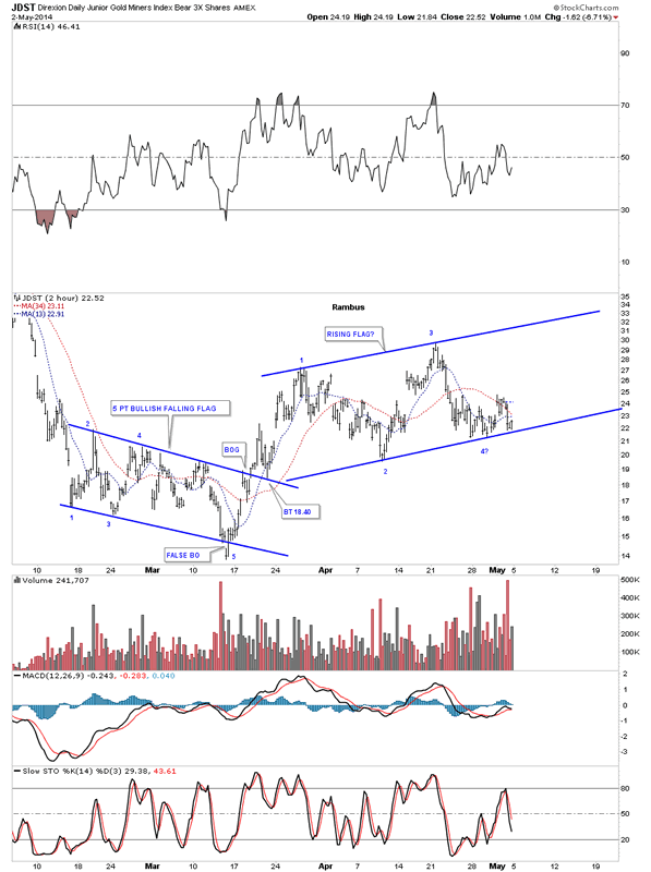 Below is another 2 hour chart that shows JDST has been in an uptrend channel or rising flag after breaking out from the blue 5 point bullish falling flag that reversed its downtrend from the December high. As you can see the price action has been bouncing along the bottom blue rail of the potential rising flag formation for over a week or so. So far noting is broken yet. That could change tomorrow with a breakout gap to the downside but at the close of trading of Friday it's still making higher lows and higher highs which is an uptrend.