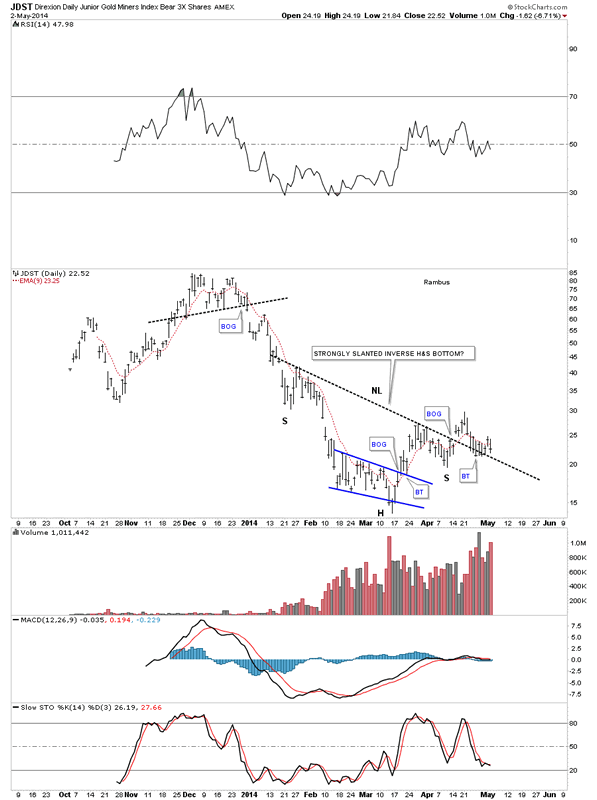 This last chart for JDST shows a strongly slanted inverse H&S bottom that is still in play even though the price action has been backtesting the neckline for close to three weeks now. This kind of price action is what wears out most investors as it tries their patience.