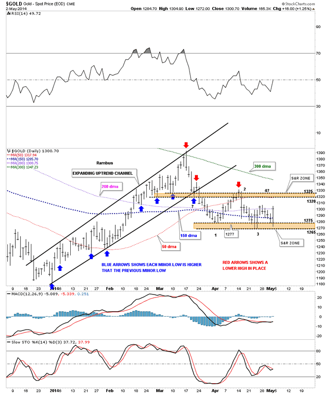 Below is the daily gold chart we've been following that shows what simple uptrends and downtrends tend to look like. The uptrend that started at the December low shows each short term low was higher than the previous short term low, blue arrows. This is a classic uptrend. Now on the right side of chart you can see how the red arrows have been showing the way lower with lower highs in place. Gold has attempted to put in a lower low at the brown shaded support and resistance zone but has failed to break through so far. This is setting up a horizontal trading range between the two brown shaded support and resistance zone with 1325 at top and 1265 at the bottom. A move to the top of the trading range around the 1325 area, that stalls out, could be the beginning of the 4th reversal point in a rectangle type of trading range. As you can see the price action is ping ponging pretty fast between the top and bottom support and resistance zones. Also this trading range is forming below the previous high which increases the likelyhood that the price action will break lower when the trading range is finished building out.