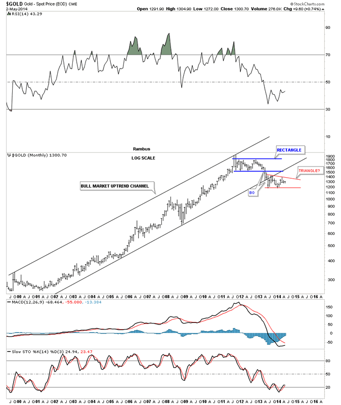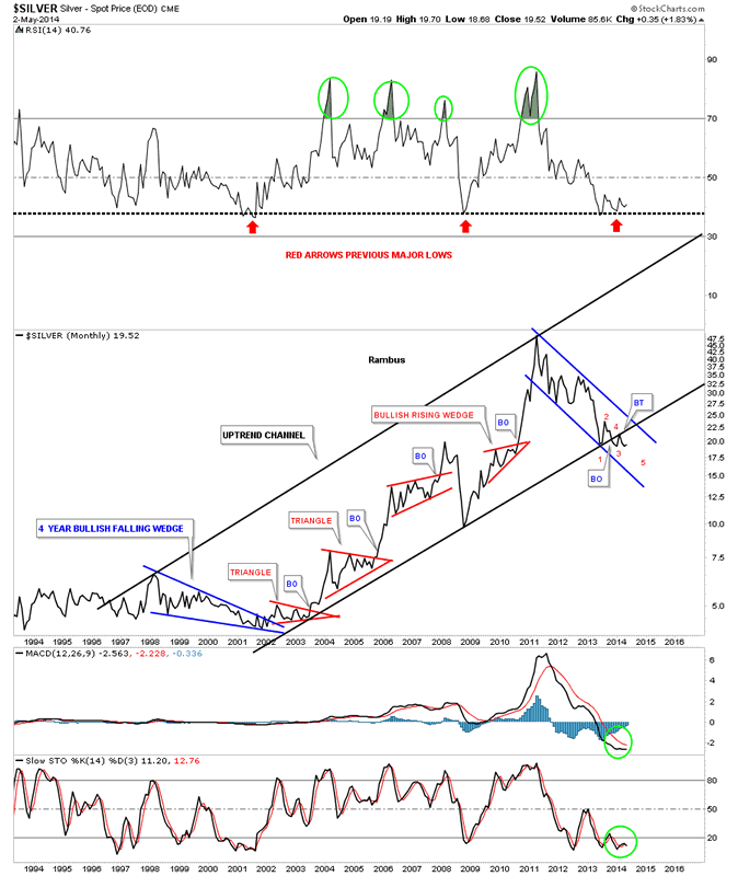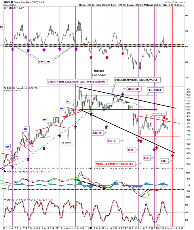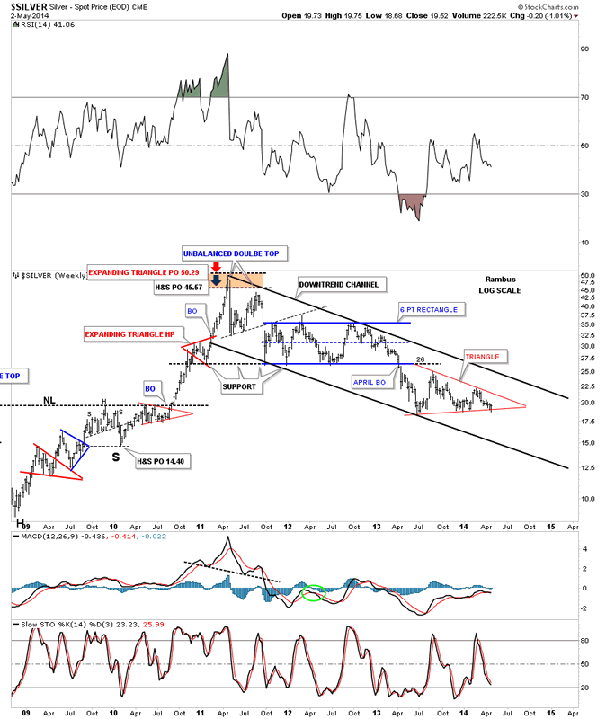 This next chart for silver shows it's downtrend channel that has been in place for three years now. There is no law that says silver can't have a 5th and 6th reversal point similar to the 6 point 22 month rectangle that formed just above the red triangle. Again all we know for sure is that silver penetrated the bottom red rail last week but rallied back inside the red triangle negating the breakout for the time being.