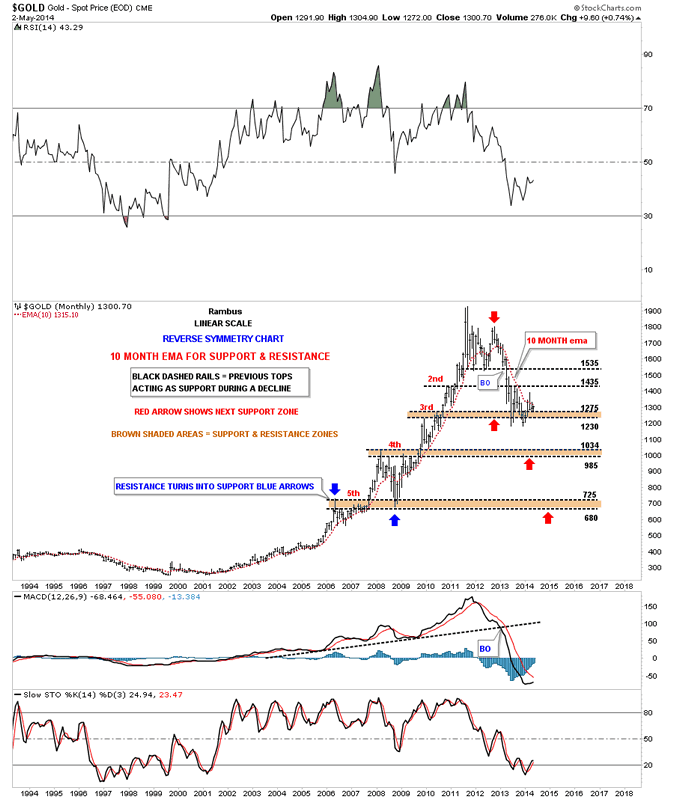 This next chart is a long term monthly chart that I call my reverse symmetry chart , using the 10 month ema. The brown shaded areas shows how the previous highs, that were made during the bull market run, should now act as initial support in a bear market. As you can see the initial collapse took the price action all the way down to the 3rd brown shaded support zone which has held support since the June low last year. You can also see how gold spiked above the 10 month ema last month but closed back below the 10 month ema by months end. Right now the 10 month ema comes in at 1315. If gold eventually breaks below the 3rd brown shaded support and zone the next area of support will be the 985 to the 1054 area, 4th brown shaded support zone.