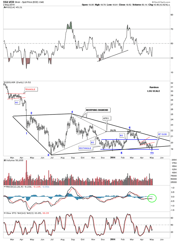 The daily chart for silver shows the price action over the last year or so that shows the original Diamond that morphed into a bigger diamond which now has completed the required even number of reversal points creating a consolidation pattern ot the downside. The only problem now is that silver can now rally back up to the top rail creating a 7th reversal point. If the price action breaks above the top rail of the Diamond or triangle it would then be a reversal pattern to the upside. That is only speculation at this time as we have 6 reversal points completed and that is what we have to go on until something changes. As you can see the apex of the smaller internal dashed Diamond did hold resistance during the breakout from the blue rectangle.