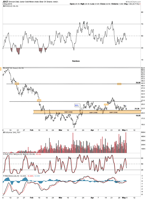 The first chart is a 2 hour bar chart that shows the brown shaded support and resistance zone that has held support since it was broken to the upside in March. As you can see it has been severely tested from the topside many times since but so far its held. So far so good for JDSTers .