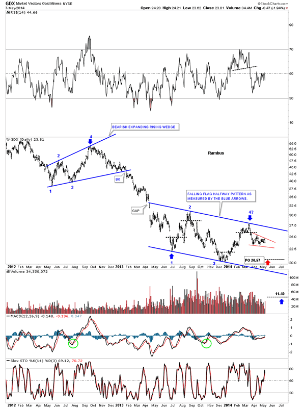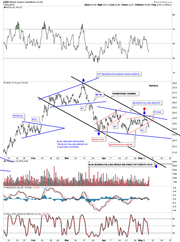 The first chart I would like to show you tonight is the one I posted today on the GDX. So far this downtrend has four separate chart patterns in it. The top is comprised of the blue 5pt bearish expanding rising wedge reversal pattern. The second pattern is the red bear flag. The third pattern is the red bearish rising wedge and the fourth and most important chart pattern is the potential blue bearish falling wedge which should be a halfway pattern to the downside.