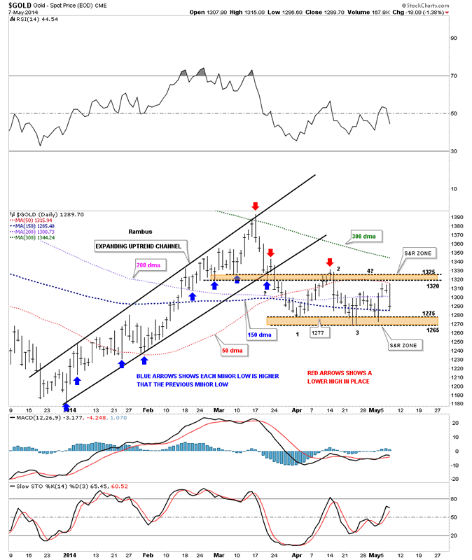Lets now look at the daily chart for gold I've been showing you that shows how an uptrend and downtrend work. The blue arrows on the left side of the chart shows a beautiful uptrend where each minor low is higher than the previous low. Since the top was put, top red arrow, just the opposite has been happening. As you can see gold has been creating lower lows down to the current price action at the 1265 area. Gold has made three attempts to break below the 1265 area that would then confirm a new low which would also confirm the continuation of the downtrend channel. You can see how violent the price action is becoming between the upper and lower brown shaded support and resistance zones. The bulls and the bears are fighting it out for control of the trend. How long this battle goes on is anyone's guess but the sideways trading range, rectangle, is trying to finish up its fourth reversal point that we have to see at a minimum to create a consolidation pattern. Now that we have more information we just need to follow the price action for more clues as to when a breakout may occur. It could happen tomorrow or next week or when it just good and ready to show its hand. There is no doubt we'll be on top of it when its ready to move.