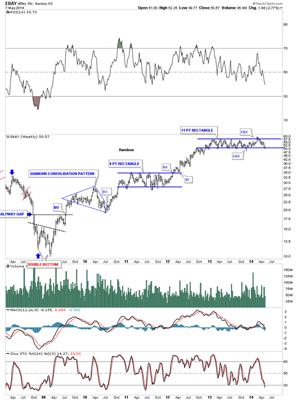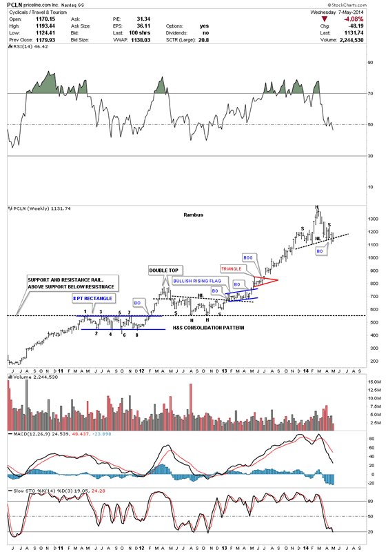The last time I posted this chart for PCLN was when it was breaking out from the H&S consolidation pattern back at the beginning of 2013. You never know what kind of price rise you'll get only that it should be a good one when a stock breaks out of a fairly large consolidation pattern. This chart also shows you a perfect example of how support and resistance works. Notice the eight point blue rectangle that formed back in 2011. Once the price action broke above the top blue rail it then reversed its role from, what had been resistance to then support as shown by the double headed H&S consolidation pattern. That is perfect Chartology 101.