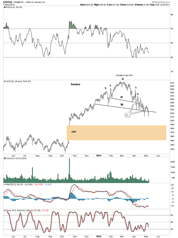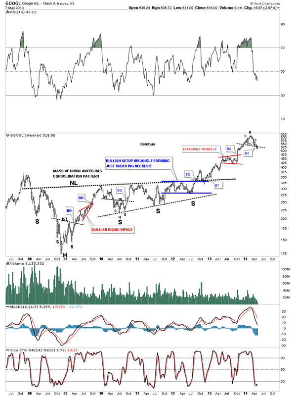 This long term weekly look at GOOGL shows how I've following this stock through the years. What is the most important thing to understand is where the H&S top, I showed you on the daily chart above, has formed on the weekly chart below. If there was ever a place to look for a H&S top reversal pattern this chart shows that place in spades.