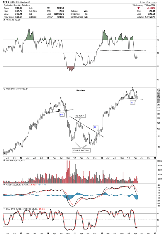 NFLX has been a high flyer but it to looks like it's building out a H&S topping pattern. Note the beautiful H&S top that was made in 2011 and the decline that followed.