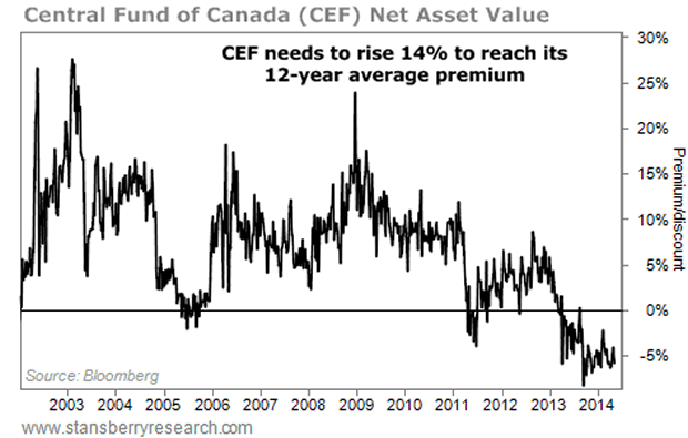 Sentiment is so negative toward gold that the Central Fund of Canada – which usually trades at a 7% premium to its liquidation value – is now trading at a 6% discount to its liquidation value. That's a remarkable change. And remember, it only holds precious metals in bullion form in bank vaults in Canada. So you are buying gold at a discount to melt value.
