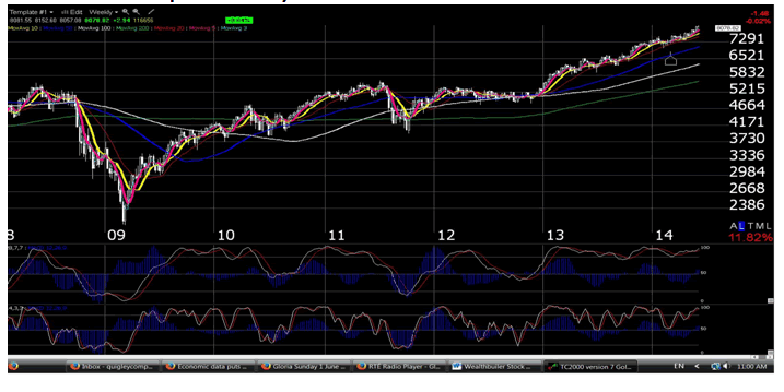 The bull market which commenced in March 2009 shows no sign of abating. On the Dow Transports and the Dow Industrials we see higher highs and higher lows and both indices are congruent.