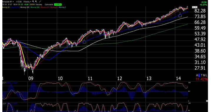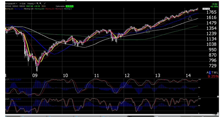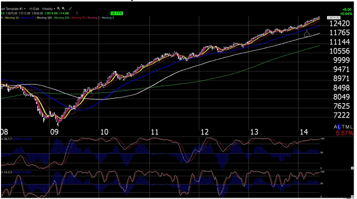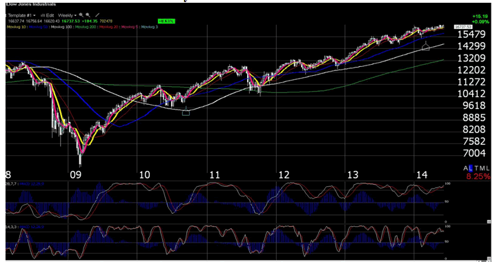 On balance, filtering all the information from the charts below, I believe the bull market is still intact. Sure there are early signals indicating exhaustion but there has been no serious technical damage in evidence to indicate near term price capitulation. On the contrary, should the European weakness discussed in the news items below become more pronounced it is possible that American GDP numbers going forward will weaken. However this news is a double edged sword. Should Janet Yellen react to negative European growth data by slowing QE tapering the market could explode into the latter stages of a hyperbolic bull. This means to me that there is as much risk being out of the market as being in. Thus, I see no easy choices for investors and money managers. The existing “wall of worry” will continue for some time longer.