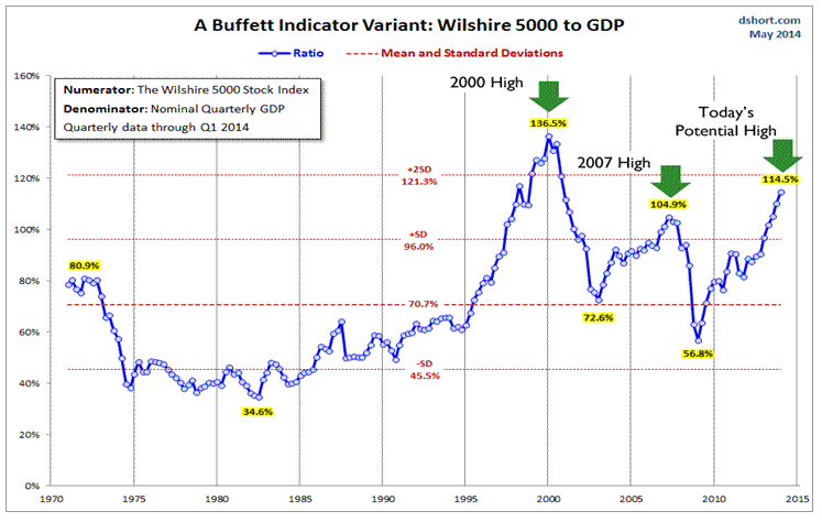 At the market top in 2007, just prior to a -54% crash in stocks, TMC was equal to 104.9%. According to Buffett’s “favorite” market timing indicator stocks are more overvalued today than in 2007.