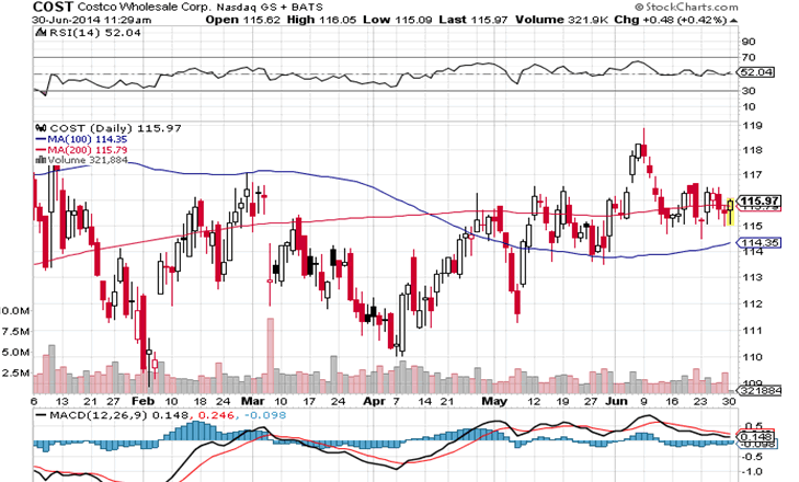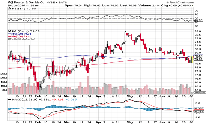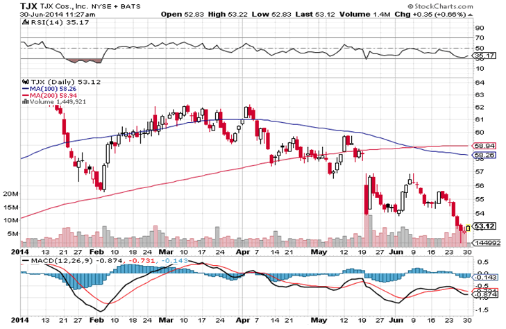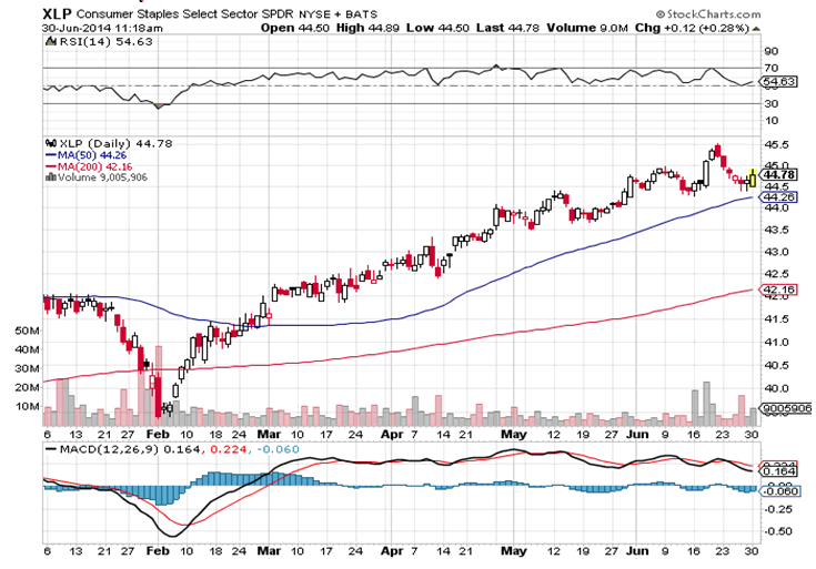 The bell-weather consumer staples ETF: XLP is also giving mixed signals. While the overall ETF is technically strong T J Max, Proctor & Gamble, Wal-Mart, Costco and Visa are showing early signs of price deterioration.