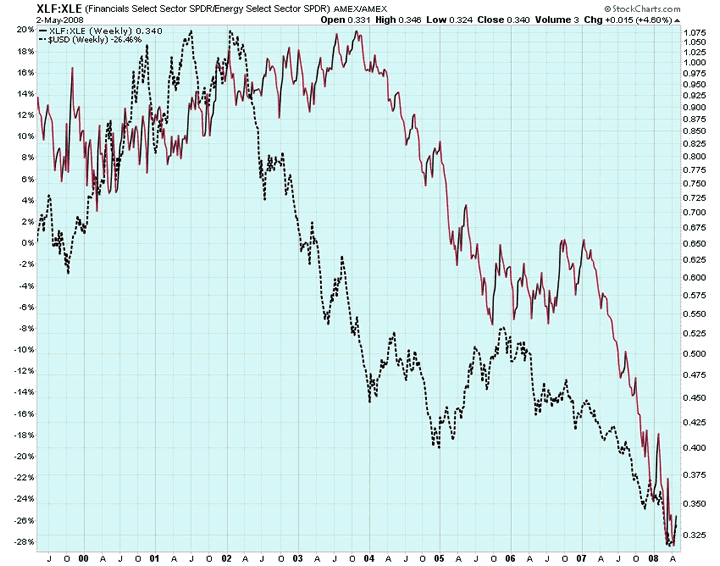 The affects of the declining U.S. currency goes beyond simply providing inflationary pressures, stronger foreign currencies and high gold prices, it also has a direct impact on how portfolios should be weighted. Since the beginning of the waterfall drop of the world's reserve currency, funds have rotated into energy stocks and out of financials. And this action is never favourable for the S&P 500.