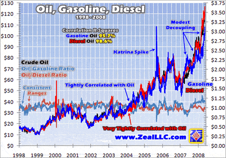Understanding the historical relationship between oil and gasoline prices is the key. As I studied this, I decided to throw in diesel too. Boiled out of raw crude oil lower and hotter in the fractionating column than gasoline, the broad economic impact of rising diesel prices may ultimately rival that of gas prices. In both cases, the new $100+ oil world will radically change longstanding notions of “normal” fuel prices.