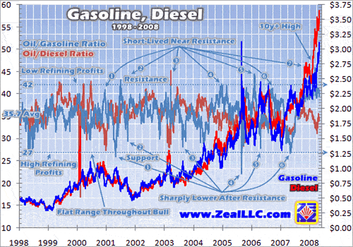 But it is not merely this ratio's average that an extremely high OGR tends to revert to, but its support near 27. At $120 oil, a long-overdue OGR support approach would mean $4.44 wholesale gasoline! This is 42.3% higher than this week's price. This would translate into a $4.99 average retail gasoline price across the United States ! If today's gasoline prices bother consumers, imagine sentiment at $5+! Ouch.