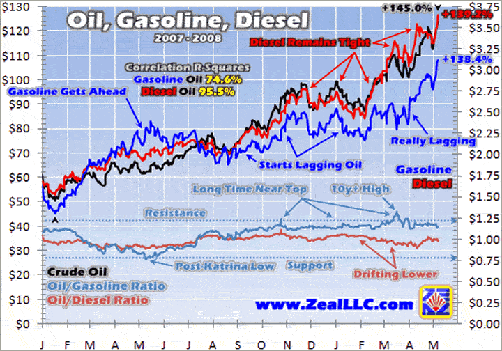 So gasoline prices started grinding lower despite rising crude in the late spring and summer of 2007. In early September, when oil surged, gasoline remained flat. This is when it started to lag crude oil. By late February 2008, the gap between gas and crude oil grew wider. This is what drove the zero crack spread in mid-March, when the costs of producing gasoline exceeded the price it could fetch in the US markets.