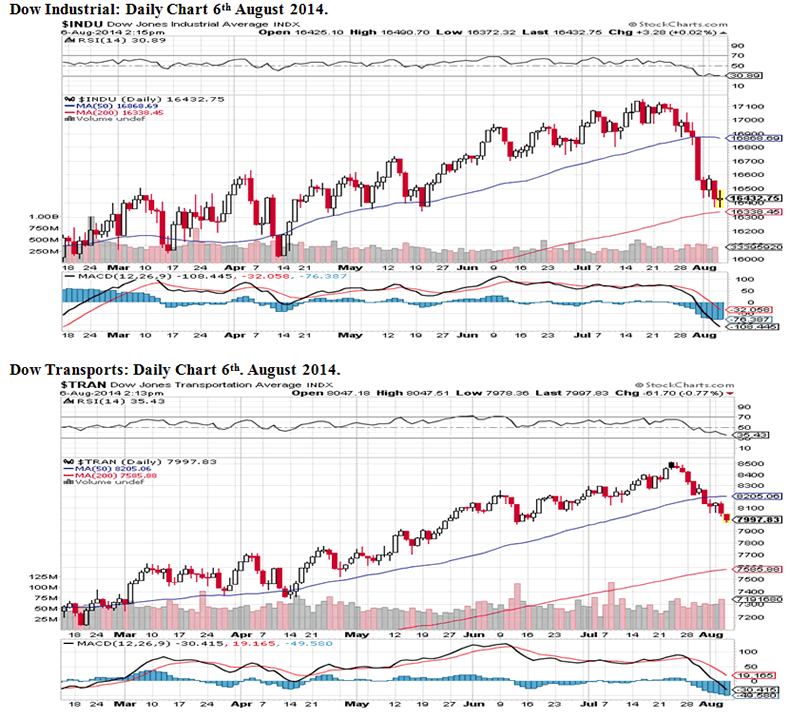An analysis of today’s charts show that on both the Dow Industrials and the Dow Transports we have 2 lower highs and lower lows and a significant lower low has been violated on the Dow Industrials. It will take time to rectify this technical weakness. Yes there will be an “over-sold bounce” but I believe breakdown rather than consolidation will occur over the next few weeks based on the impulsive strength of last Thursday’s price action, therefore sell and keep your powder dry to buy back in when true consolidation has occurred.