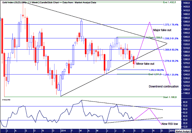 I have added Fibonacci retracement levels of the recent upleg from the June low to July high. This has already been a deep retracement and the next support level is the 88.6% level which stands at US$1252. Perhaps we will see a move down to there early next week before the belated reversal higher begins.