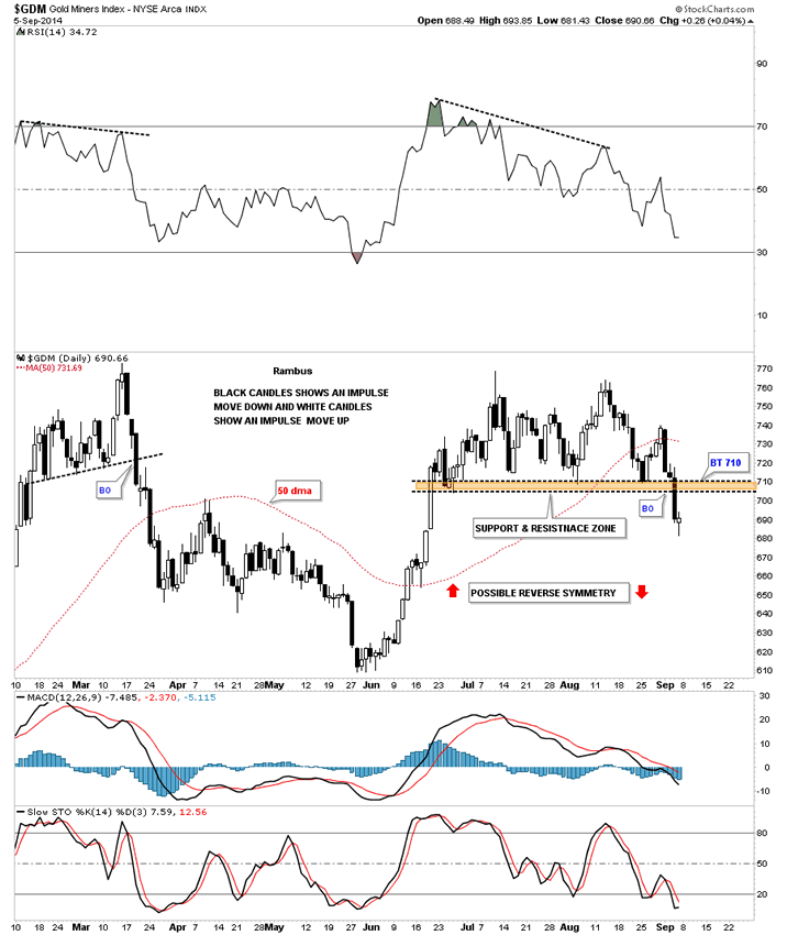 This first chart for GDM shows the two month trading range that one could call either a double top or if you use your imagination you can see a double headed H&S top with a small left and right shoulder. It really doesn't matter what you call the trading range above the brown shaded support and resistance zone, it's the S&R zone that matters the most. That S&R zone is now our line in the sand, above is bullish and below is bearish. If GDM is indeed starting a new impulse move lower we should start to see a bunch of black candles forming one below the next. Note all the white candles that formed during the rally off of the June low which told us the move was strong. One last point on the chart below. I've labeled the price action below the brown shades support and resistance zone as having a possible reverse symmetry move down which would look similar to the June rally only in reverse. The main thing to keep an eye right now is to see if we get a backtest to the previous support zone at 710 that should now reverse its role and act as resistance.