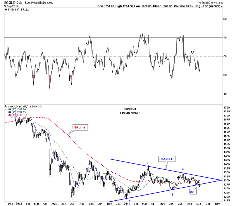 Lets now look at a few gold charts and see what's happening there. This first chart shows the blue triangle that started to form the same time GDM started to form its triangle. The big difference is gold has broken below its bottom rail while GDM is still trading in the middle of its potential triangle. Gold is trading below all the moving averages on this chart with the 150 ma being the most critical.