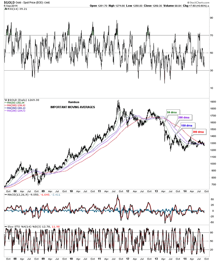 Below is a long term daily chart for gold that shows all the most important moving averages. As you can see the price of gold is trading below all the moving averages at this time. These moving averages actually work best when there is a strong move either up or down as show by how they aline themselves. When they are all bunched up together it tells you there is a top, bottom or consolidation pattern forming.