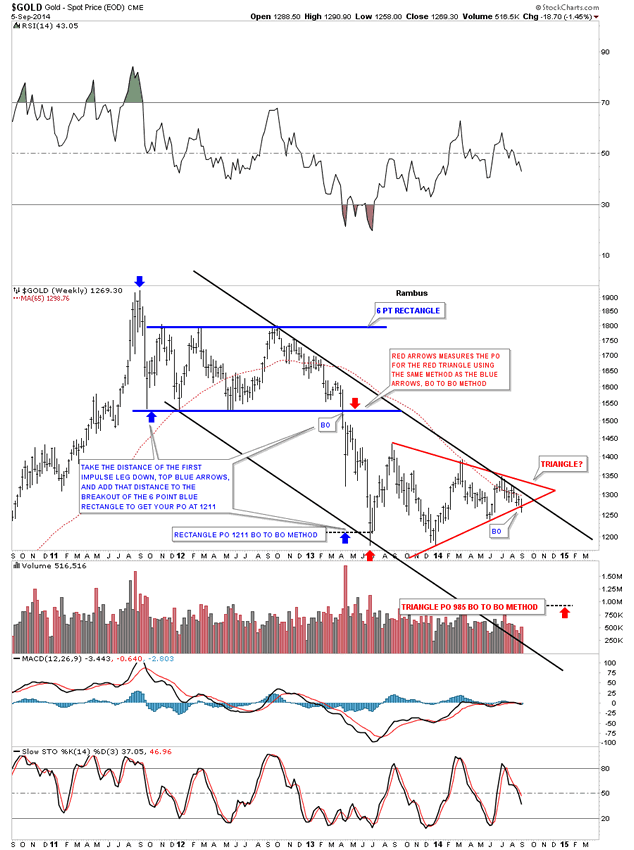 This next chart for gold is a weekly look that shows the 65 week moving average acting as resistance since early 2013. This weekly chart also shows you the downtrend channel that has the blue rectangle and the red triangle forming between the top and bottom rails. I've added instructions on how I measured for the price objective of the 6 point blue rectangle. If the red triangle plays out to the downside I used the same measuring technique that would give us a price objective down to the 985 area. Note the last bar on the far right hand side of the chart. Is this the beginning of the next impulse move lower or will we get a fake out breakout? I don't think we'll have to wait very long for an answer one way or the other.