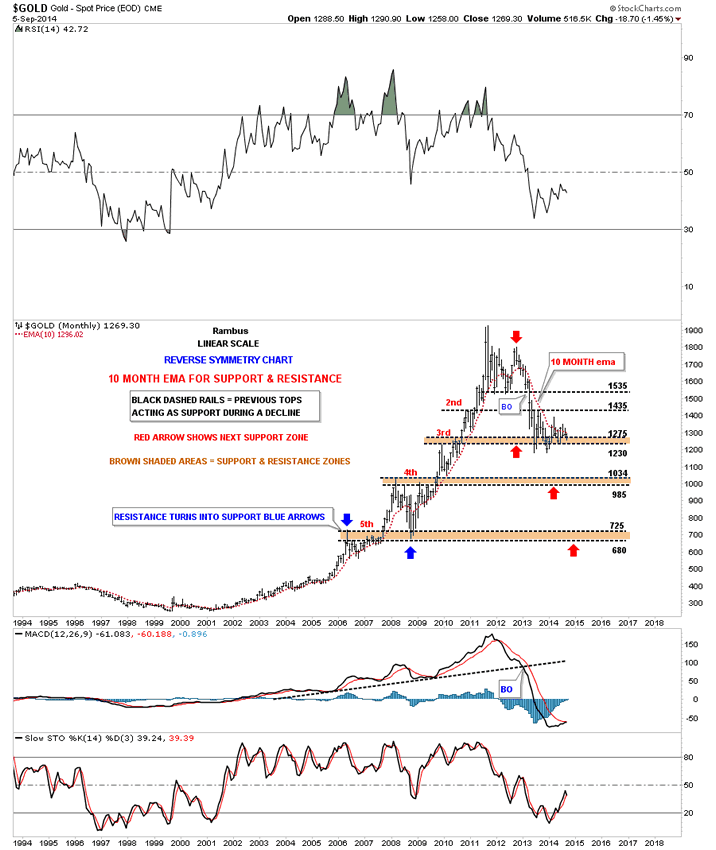 Lets look at one more long term chart for gold the monthly bar chart. This chart shows the 10 month ema that did an outstanding job during the bull market years for holding support. Even during this bear market it has done a good job of holding resistance. This chart also shows you where I would expect support to come into play if things breakdown for gold, the brown shaded S&R zones. As you can see the 985 to1034 would be the next critical support area for gold.