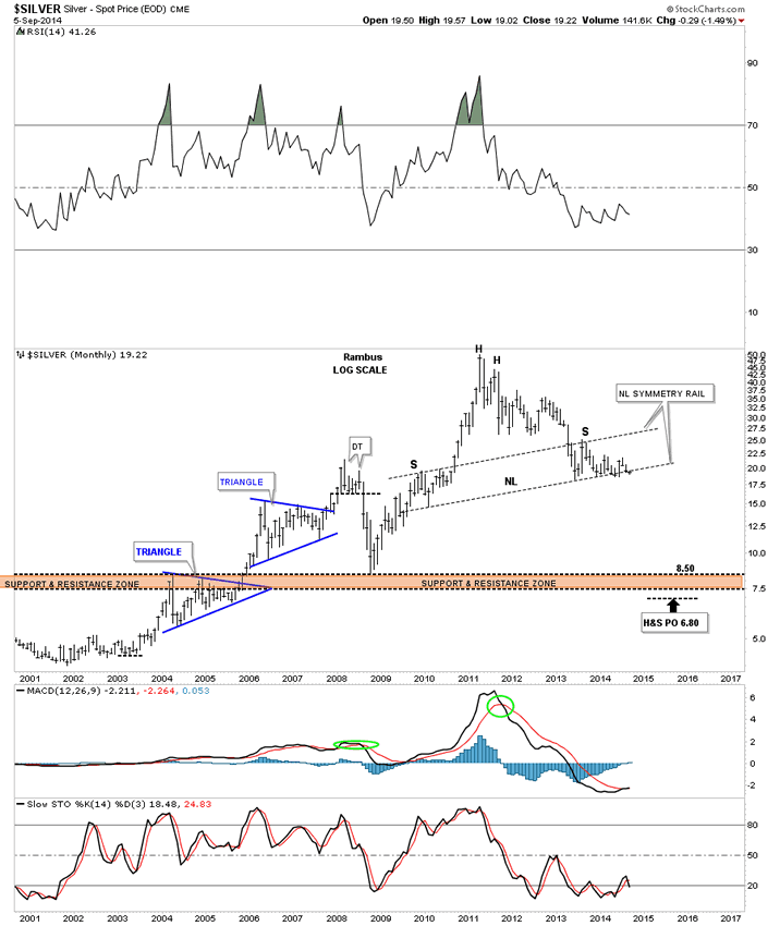 Lets take a look at the long term silver chart that we've been following for close to a year now. The price action hit that potential neckline in June of 2013 and has been finding support ever since. As long as neckline holds the potential H&S top is just that a potential H&S top but if the neckline ever gives way it would be a tough ride down if you were bullish on the white metal. One step at a time.