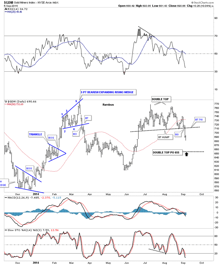 This daily bar chart for GDM shows the double top price objective which would come in around the 655 area at a minimum.
