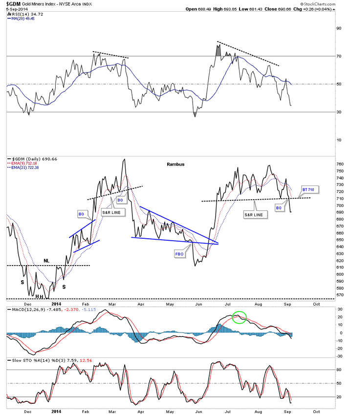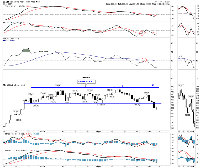 I think last weeks move to new multi week lows on GDM could very well be a warning shot across the bow for the big cap precious metals stocks. The possible backtest to the 710 area is going to be the most important area to keep track of. That's our line in the sand, give or take a few points, that will let us know which direction the big cap PM stocks want to go. The first part of the week maybe very choppy with some wild swings as the bulls and the bears fight it out for dominance of a new trend that should start to emerge anytime now.