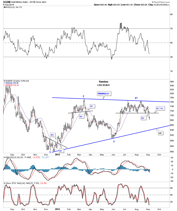 Next I would like to start painting the bigger picture if our current top is indeed the top we've been looking for. Last December GDM finally found support at the 560 area which led to a rally that took the price up to the March high. This created the first reversal point in a possible consolidation pattern or topping pattern. GDM then reserved direction and headed back down to the June low at reversal point #3 which was a higher low than reversal point #1.This completed the second reversal point. At that point reversal point #3 began which took GDM up to our current top completing the third reversal point that is making a lower high than reversal point #1 which is giving us a triangle looking pattern. The fourth reversal point won't be complete until the price action hits the bottom trendline at 645 or so. It may sound confusing but when you look at the chart below is becomes very obvious. So the next important area to watch, if indeed the top is in place, will be the bottom rail of the possible blue triangle at 645.