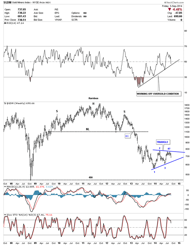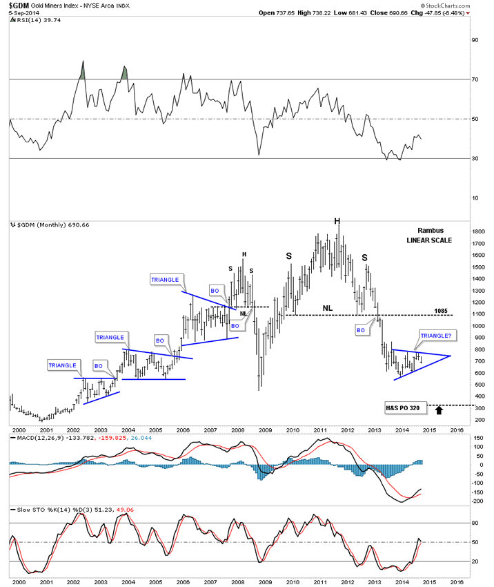 This last chart for GDM is a monthly look that shows the massive H&S top and the decline that ensued. This linear scale chart has a price objective down to the 320 area. Note the three blue triangles that formed during the bull market years and compare our current triangle that is similar in nature that has been forming during the bear market. In an uptrend a consolidation pattern will usually breakout to the upside and in a bear market the consolidation pattern will break out to the downside. The odds favor our current and possible triangle will breakout to the downside.