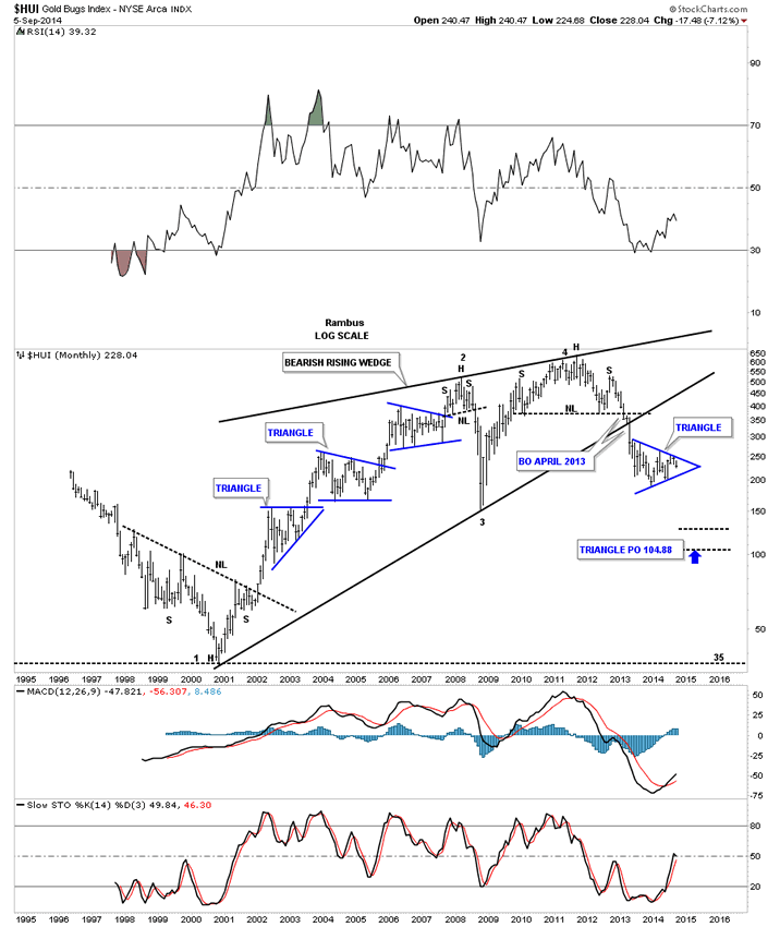 I would like to throw in this long term chart for the HUI that puts our potential blue triangle in perspective. Note that during the bull market years the HUI constantly made higher high and higher lows. Now compare that uptrend to our current downtrend that has made a series of lower highs and lower lows since the bull market peak in 2011.