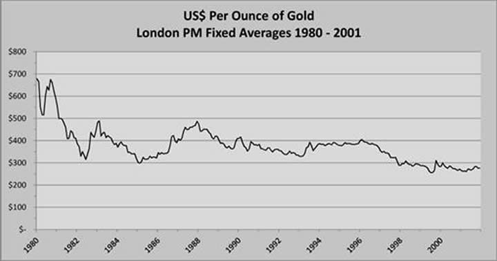 Despite unprecedented levels of credit creation and money printing by governments, over the next 20 years the price of gold would fall 70 % as central bankers flooded markets with leased central bank gold forcing gold lower.