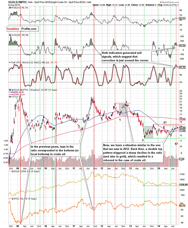 Looking at the above chart, we see that now we have a similar situation to the one that we saw in 2012 (we marked it with red). Back then, a double top pattern triggered a sharp decline in the ratio, which resulted in a rebound in crude oil. Based on that event, we think that we'll see a drop in the ratio in the coming weeks - especially when we factor in the fact that the CCI and Stochastic Oscillator generated sell signals. On top of that, this bearish scenario is also reinforced by the current Elliott's waves structure.