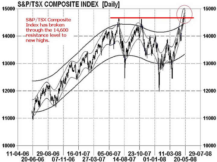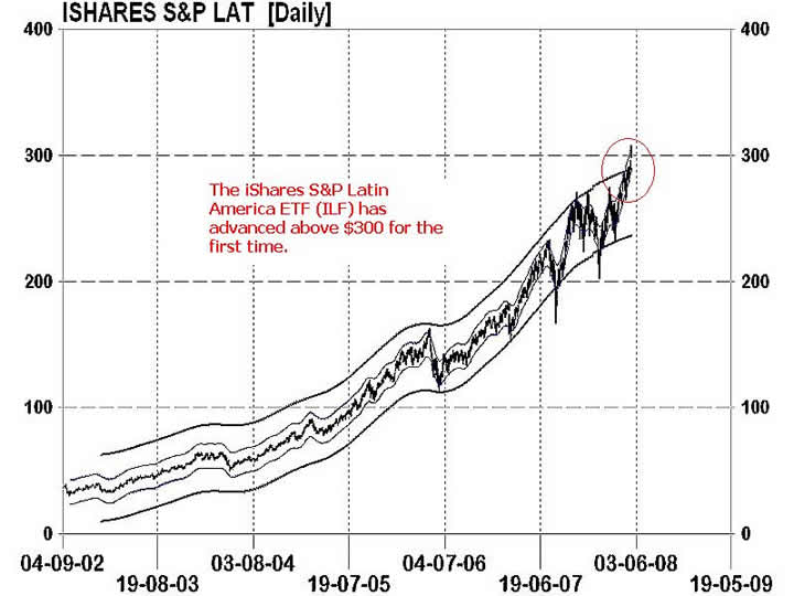 This advance in the commodity's value has rocketed the profits of many energy companies in 2008 which has lifted those world stock indexes that are heavily weighted to this commodity to the top of their class. The stock indexes of Canada (Chart 2), Russia and several Latin American countries (Chart 3) have out performed virtually all other indexes including the S&P 500 and NASDAQ. And with the fundamental demand over supply favouring higher energy prices in the future, these few oil and gas weighted equity indexes will likely remain the best performers in the years to come.