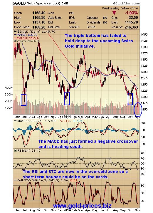 The triple bottom has failed to hold despite the upcoming Swiss Gold Initiative, but there are still a few weeks to go and a week can be a long time in the precious metals arena.