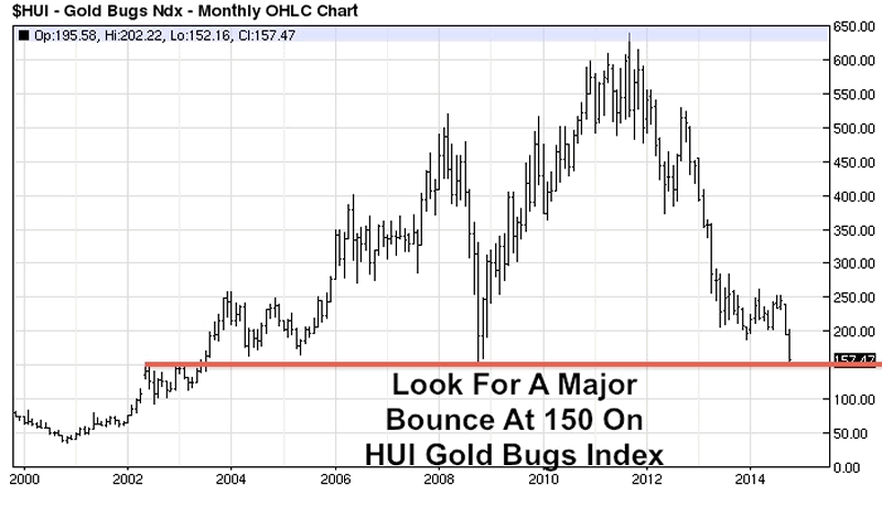Smart resource investors expecting capitulation have had some of their bids filled at ridiculously low prices. Fortunes are made by the brave who pick up real assets when the majority is not interested in them. I expect a major bounce at 2008 credit crisis lows and the 2003 breakout on the HUI Gold Bugs Index at $150.