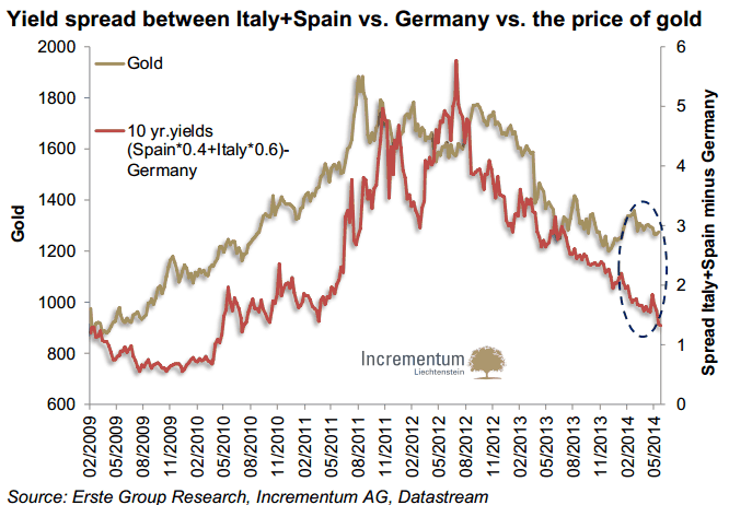 The gold price has definitely been suffering from the temporary return of confidence, for instance in the euro area. The spread between Italian and Spanish to German government bond yields has been declining significantly for many months and was recently at the lowest level since 2011, as evidenced by the following chart. This signals that tail risks in the euro zone have recently been priced out.
