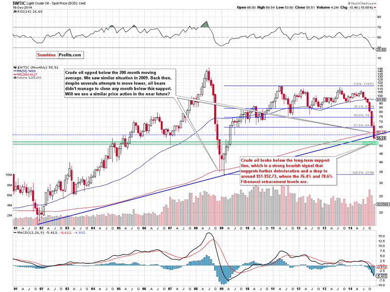 The first thing that catches the eye on the above charts is a breakdown below the long-term blue support line (based on the 2002 and 2009 lows and marked on the monthly chart) and the 70.7% Fibonacci retracement based on the entire 2009-2014 rally (marked with green on the weekly chart), which suggests further deterioration in the coming day (or days). If this is the case, the commodity could drop to around $51-$52.73, where the 76.4% and 78.6% Fibonacci retracement levels are.