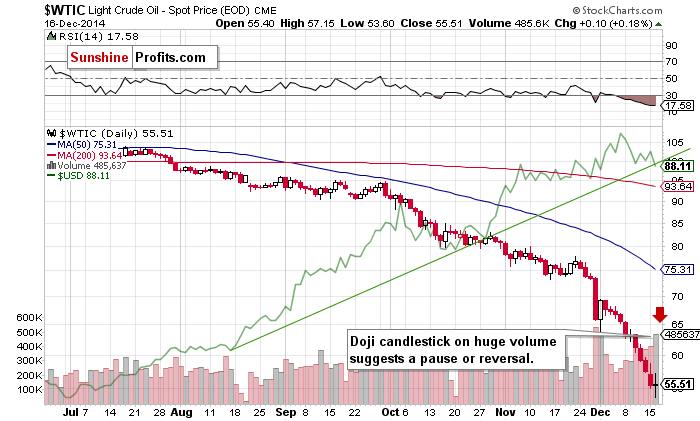 If the long-term outlook is that bearish, then why can we expect a pause here? Because on a short-term basis we saw a daily reversal (doji candlestick) on significant volume.