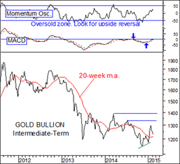On the charts, our technical indicators remain on an intermediate-term buy signal for gold. Gold itself is rallying from a rising double-bottom (a higher low on its last decline), and has broken out above its 20-week moving average again. First levels of potential overhead resistance are at $1,340 and $1,400 an ounce.